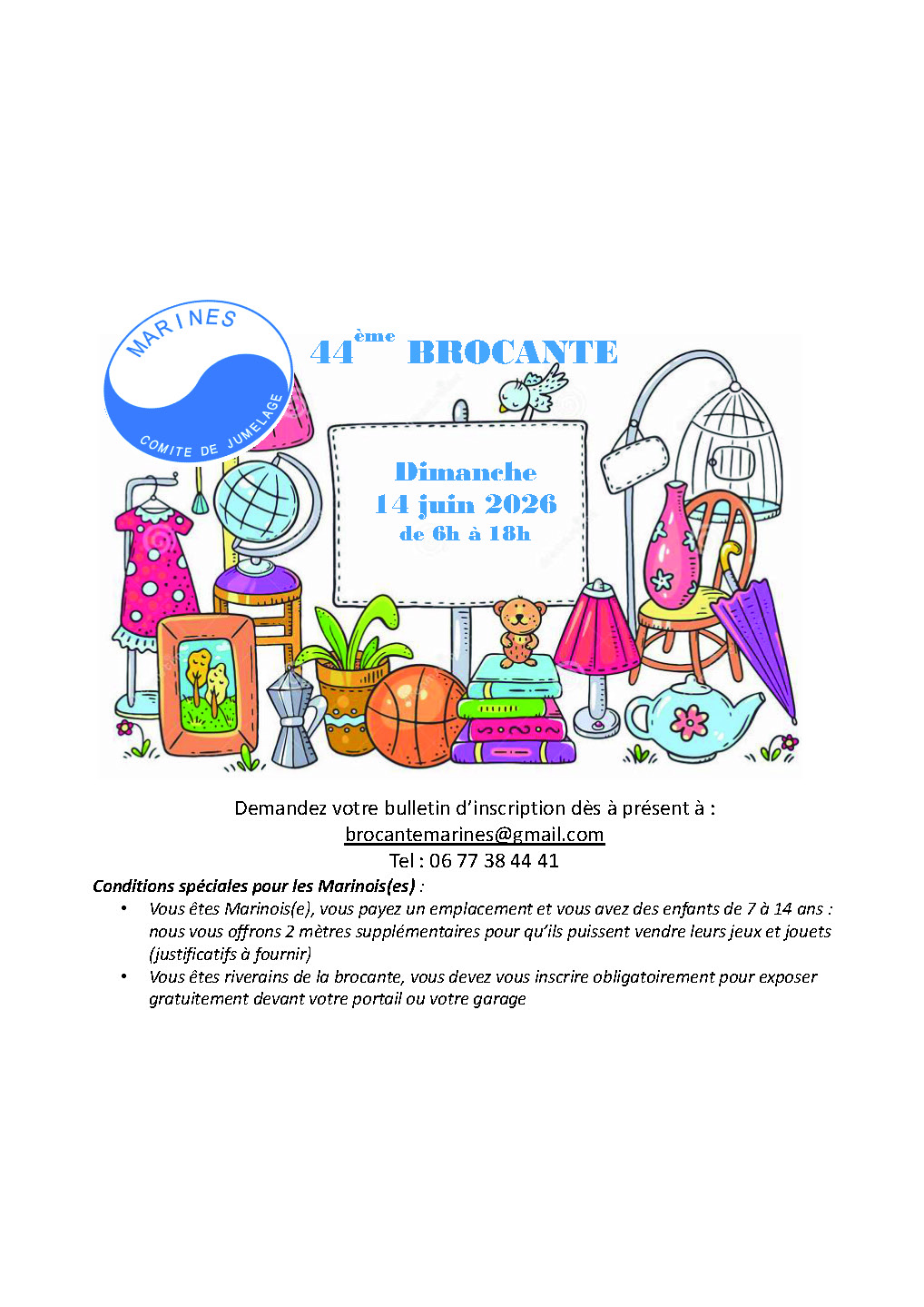 La brocante de Marines se déroulera le dimanche 14 juin 2026 de 6h à 18h. Le bulletin d’inscription vous sera distribué en même temps que le sam du mois de mai.