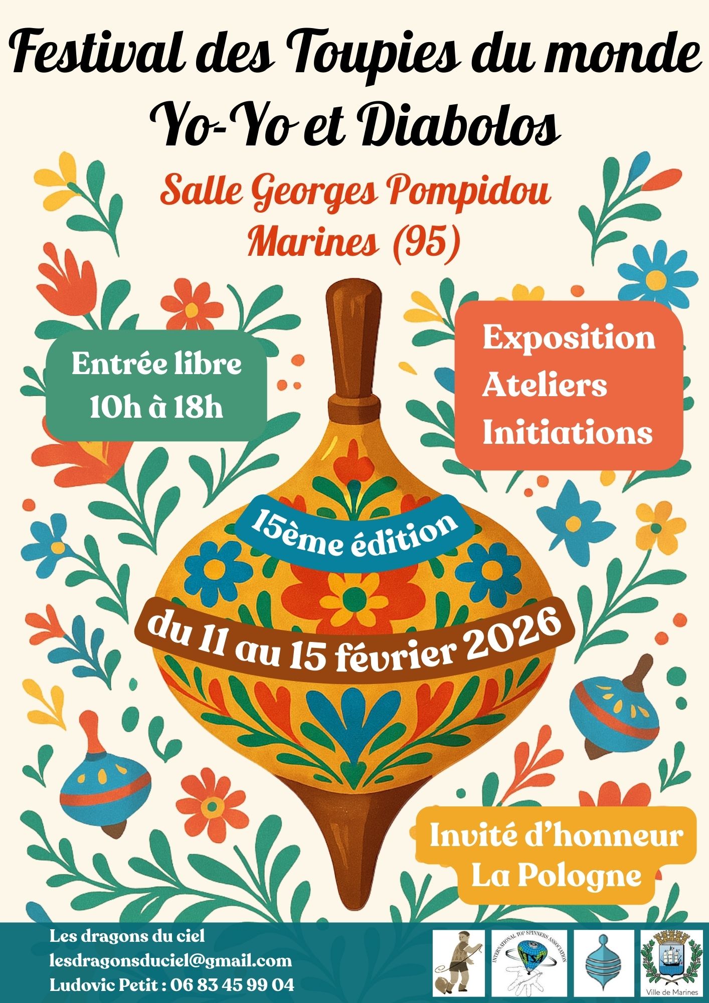 Du 11 au 15 février 2026 de 10h à 18h, la ville de Marines accueillera la 15ᵉ édition du Festival international des toupies, yo-yo et diabolos, organisé par l’association Les Dragons du Ciel.