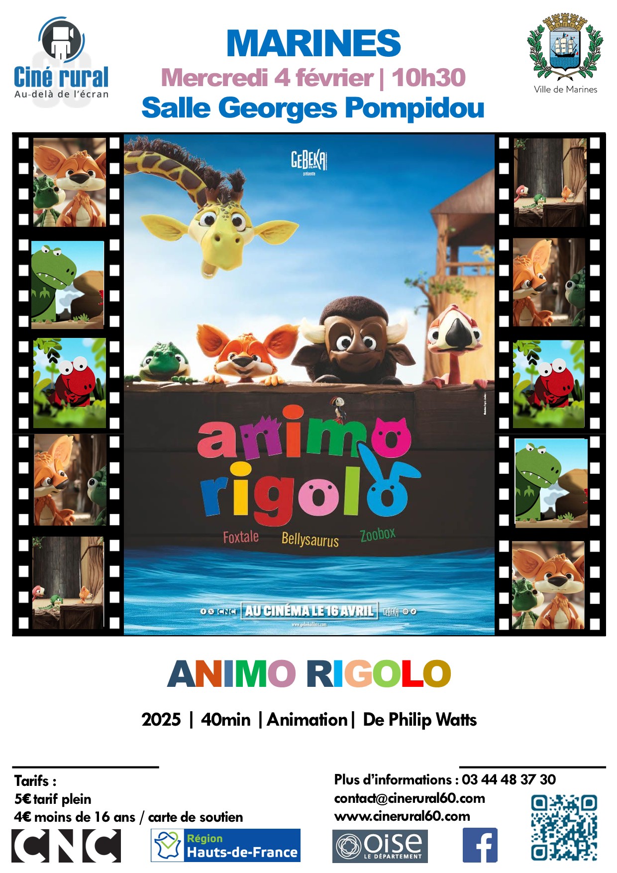 La commune de Marines et Ciné rural vous proposent une séance de cinéma le mercredi 4 février 2026 à 10h30 à la Salle Georges Pompidou : Animo Rigolo. Tarif : 5 euros (4 euros pour les moins de 16 ans)
