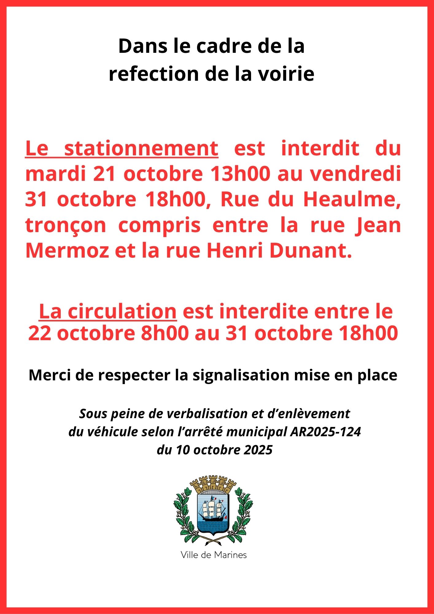 FERMETURE RUE du Heaulme pour réfection